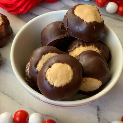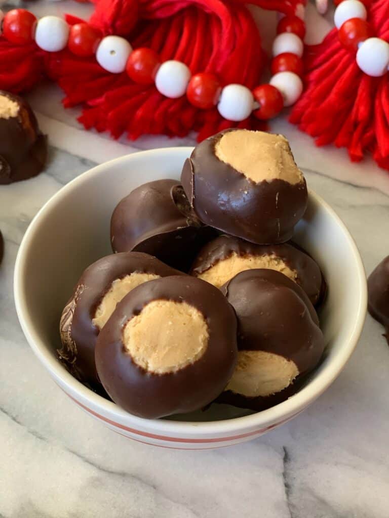 If you are not familiar with a buckeye, they are a homemade peanut butter ball dipped in melted chocolate. Think Reese’s Peanut Butter Cup in a bite sized form.