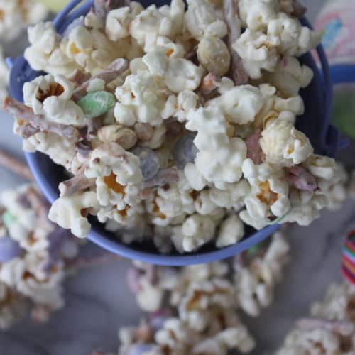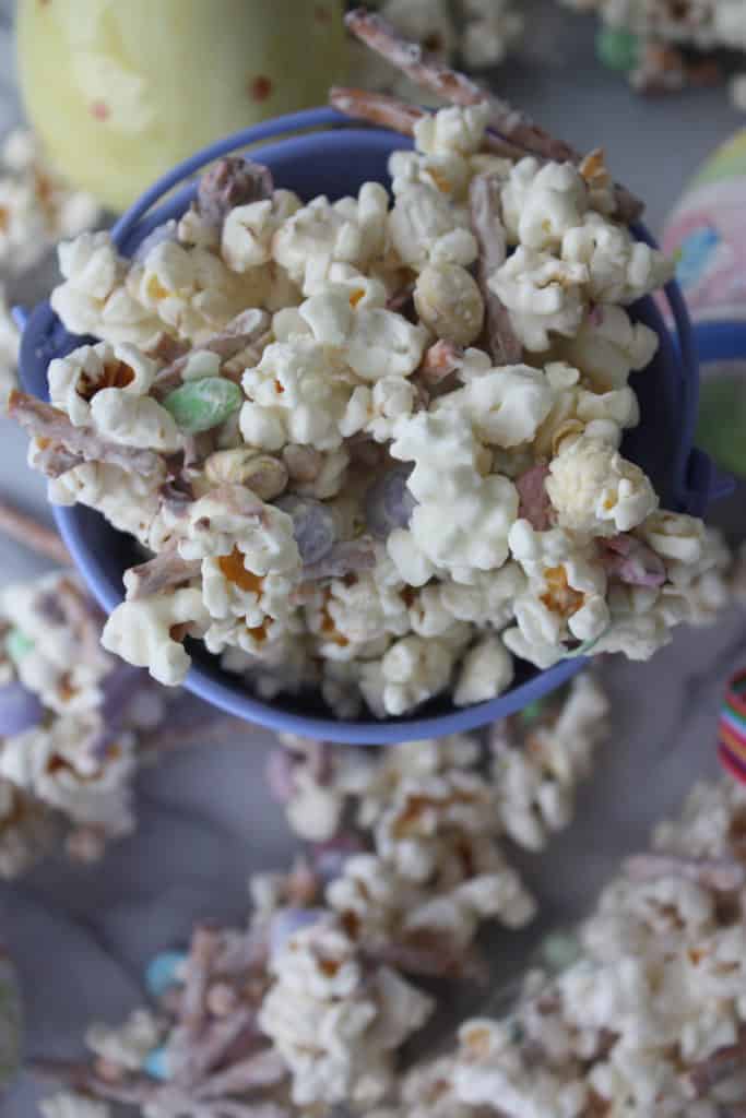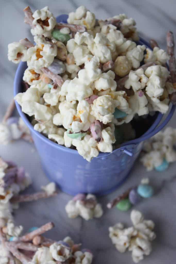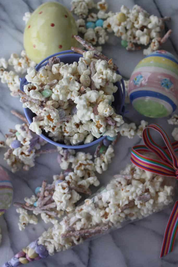 Putting this mix together will take no time. You can even let your kids help. All you have to do is pop some popcorn, melt white chocolate, break up some pretzels and stir it all together with M&Ms! It is really that easy! If you wanted to make it extra festive you could add Easter themed sprinkles before the white chocolate sets!