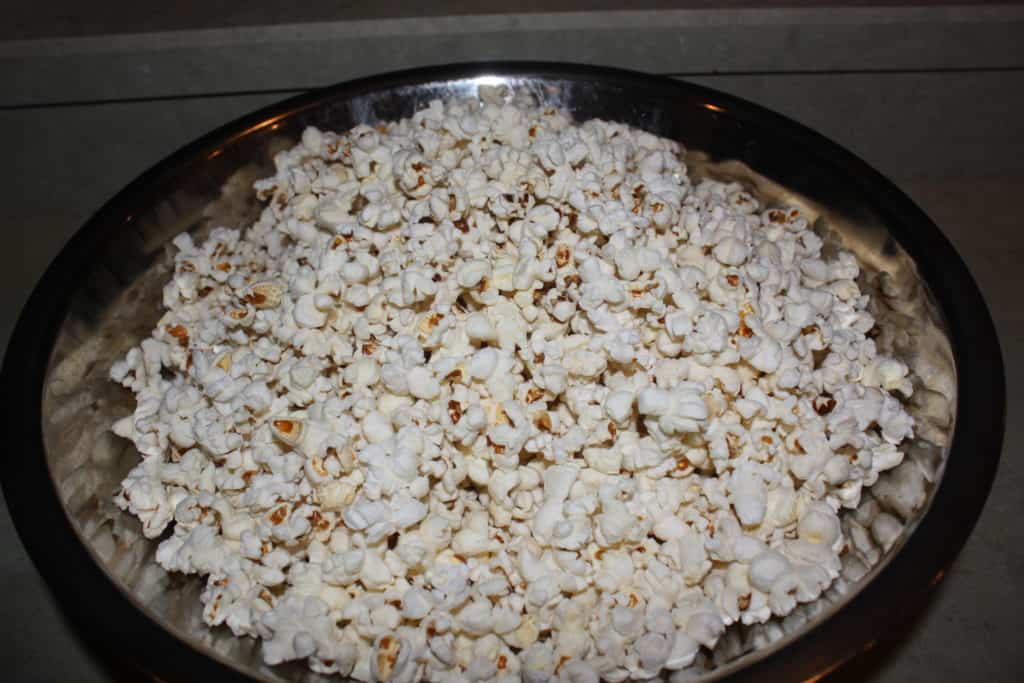 Once you have poured all of the gooey deliciousness over the popcorn, stir to help evenly coat the popcorn.