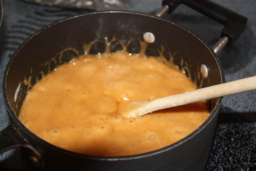Once I had my popcorn popped, I was ready tor turn it into delicious caramel corn. I took brown sugar, butter, corn syrup, vanilla and salt in a saucepan and brought it to a boil. You will let the mixture boil for 5 minutes stirring occasionally. After 5 minutes, remove the pan from the heat and quickly stir in cream of tartar and baking soda.