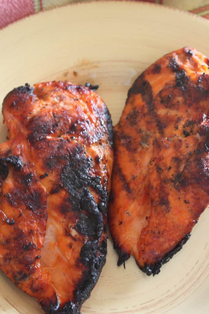This Chicken Montery takes about 2 minutes to put together. Take chicken breasts and place them in a ziplock bag and pour the Catalina dressing over it. Seriously, it’s that easy! I like the chicken to marinate for a couple of hours. If you don’t have that much time, you can marinate it for about 15 minutes and then brush the chicken with some of the dressing at the end of grilling.