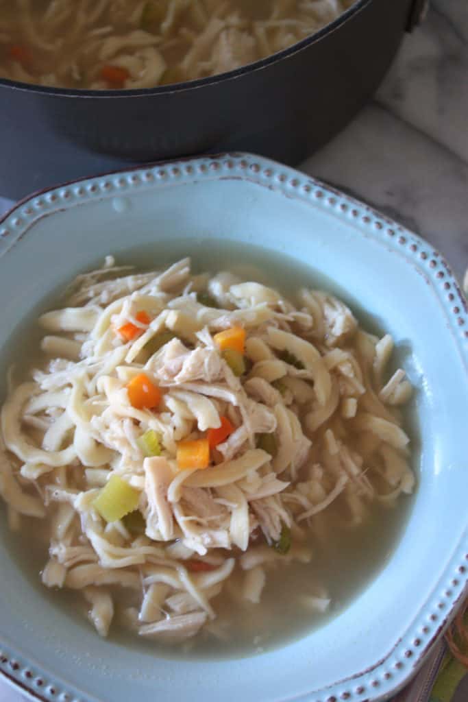 This Homemade Chicken Noodle Soup recipe is so quick to throw together. I usually start heating the broth while I’m chopping the carrots and celery. You can have this delicious homemade soup on the table in just a little over 30 minutes.