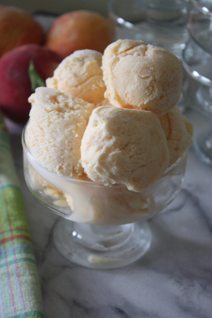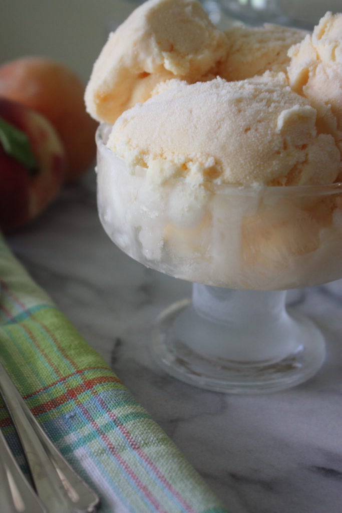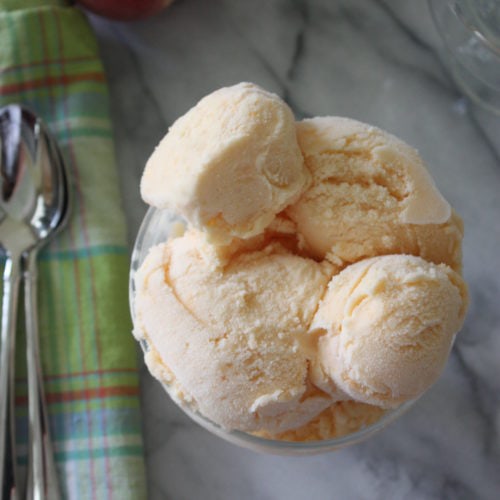 Homemade ice cream is a favorite for my family and this Peach Ice Cream is their favorite variety. We usually only have this once, maybe twice a year at the most. I only like to make it when I have really good peaches that are a little on the ripe side. That’s when you’ll get the most peach flavor. If you find yourself with not so flavorful peaches, a trick I use is to shake a little dry Jell-O powder into your peach puree. It will really elevate the peach flavor.