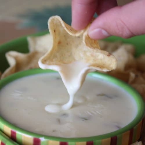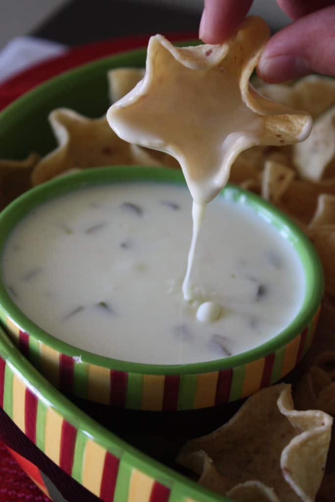The thing I like most about this recipe is that it has a nice thin consistency. I think the key is using the cheese you get from the deli counter. I use Land O’Lakes brand because that was what was suggested and it works great. You won’t get the same consistency if you use a product like Velveeta Queso Blanco. To me, it thickens up too quickly.