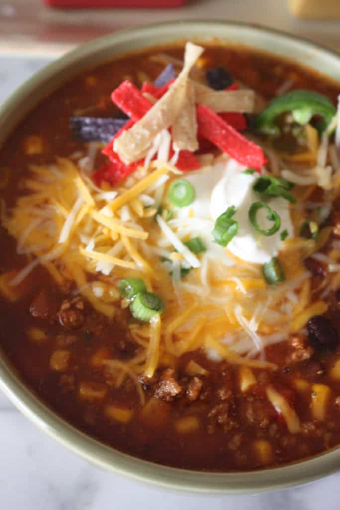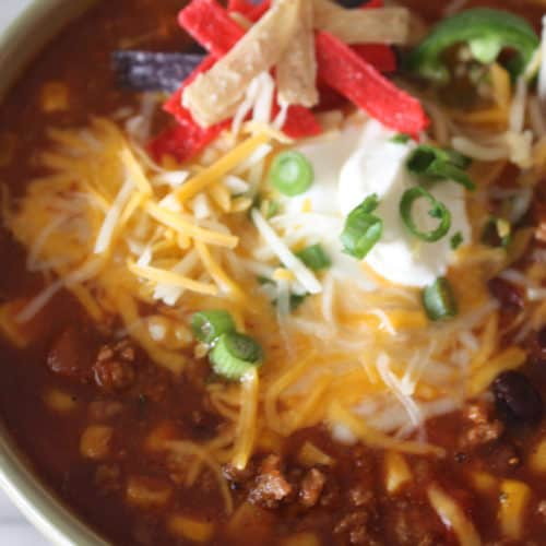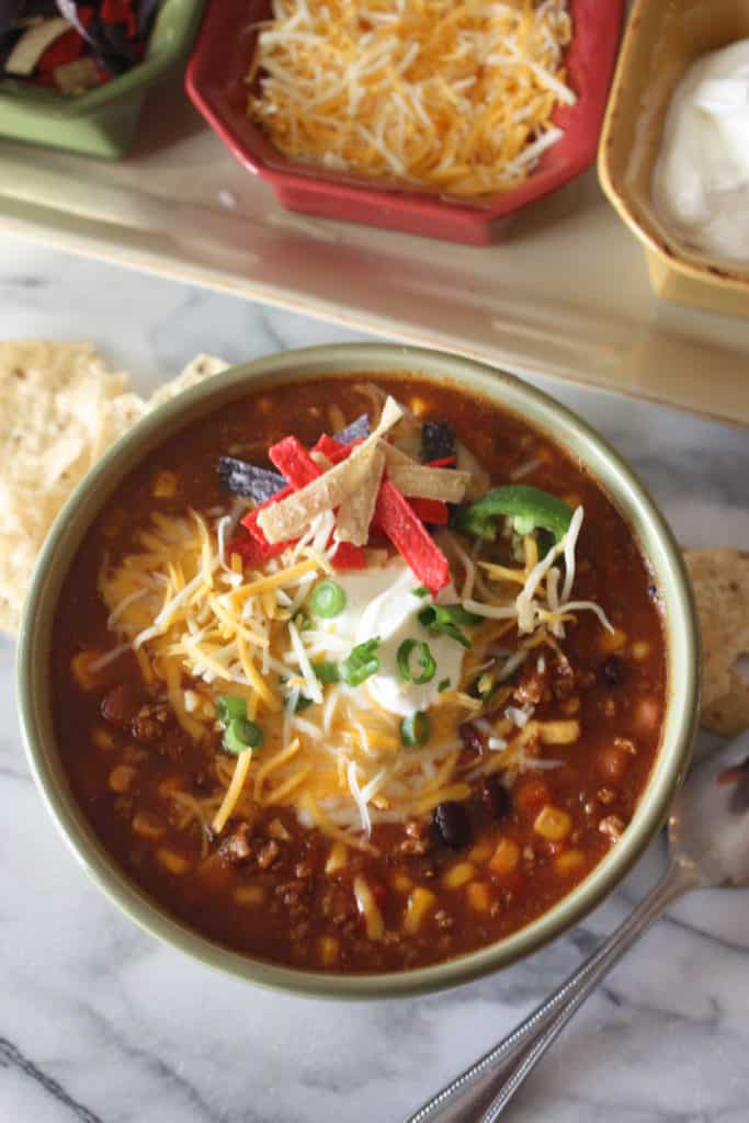 This Taco Soup comes together in no time. All you have to do is brown hamburger and open some cans. The slow cooker does the rest. Another great thing about this soup is that it feeds a lot of people and is a crowd pleaser. I like to serve taco soup with a toppings bar. My favorite toppings are, shredded cheese, sour cream, a sprinkling of green onions and some tortilla strips.