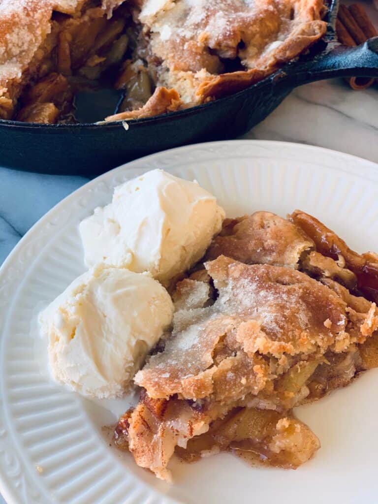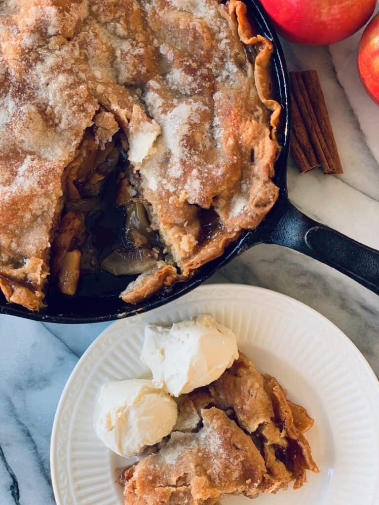 Once the crust gets nice and golden brown take the skillet out and let it cool for a bit. You want to let it cool long enough for the filling to set up but you want the pie to still be warm. Serve it with a little vanilla ice cream. That’s the best combination with the warm pie!