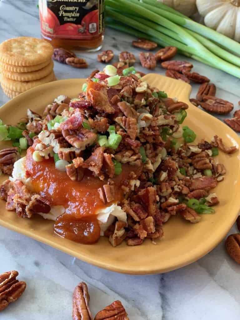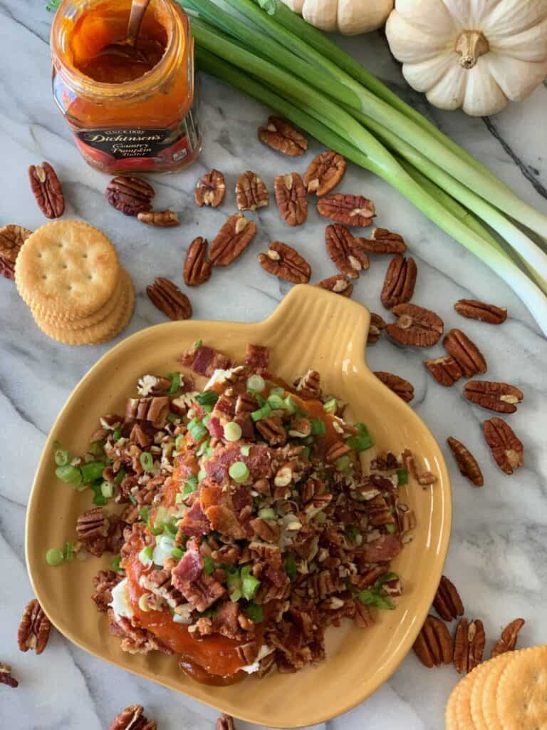 - Layer on a plate, cream cheese, topped with pumpkin butter. Sprinkle bacon, green onions and pecans on top.